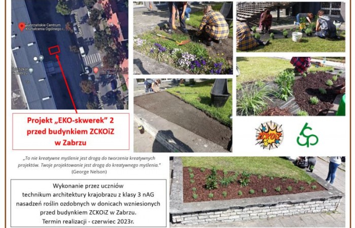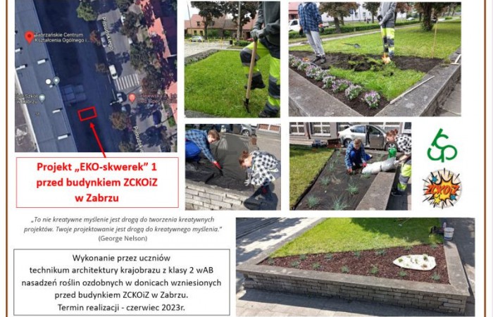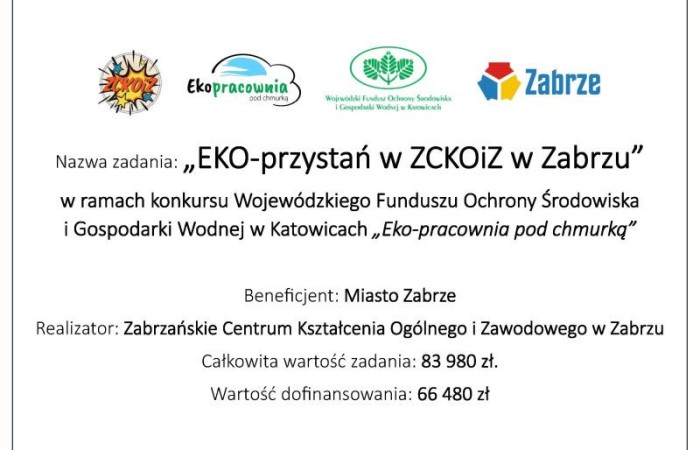 Dzięki pracy nauczycieli oraz uczniów zawodu technik architektury krajobrazu powstał projekt „EKO-PRZYSTAŃ w ZCKOiZ w Zabrzu”, który znalazł się na liście zwycięskich placówek oświatowych. Nasza szkoła uzyskała dotację z Wojewódzkiego Funduszu Ochrony Środowiska w kwocie 66 480 zł na realizację wyżej wymienionego projektu o łącznej wartości 83 980 zł.