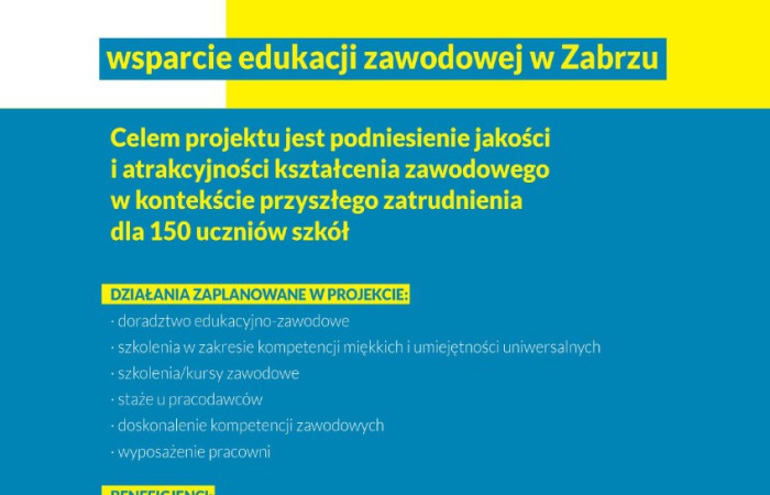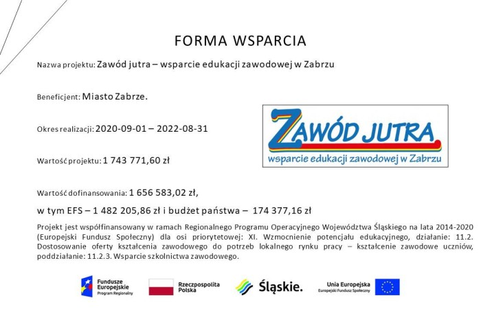 Projekt współfinansowany w ramach Regionalnego Programu Operacyjnego Województwa Śląskiego na lata 2014-2020 (Europejski Fundusz Społeczny) dla osi priorytetowej: XI. Wzmocnienie potencjału edukacyjnego, działanie: 11.2. Dostosowanie oferty kształcenia zawodowego do potrzeb lokalnego rynku pracy – kształcenie zawodowe uczniów, poddziałanie: 11.2.3. Wsparcie szkolnictwa zawodowego. Celem projektu „Zawód jutra – wsparcie edukacji zawodowej w Zabrzu” było podniesienie jakości i atrakcyjności kształcenia zawodowego w kontekście przyszłego zatrudnienia uczniów zabrzańskich szkół. Osiągnięcie celu jest możliwe dzięki działaniom nakierowanym na wyposażenie uczniów w kwalifikacje/umiejętności zgodne z wymaganiami rynku pracy, w tym kompetencji kluczowych i zwiększenie efektywności kształcenia w wyniku wyposażenia nauczycieli lub instruktorów zawodu w dodatkowe umiejętności i kompetencje zawodowe, a także doposażenie pracowni zawodowych 5 Szkół, w tym 4 nowe pracownie, aby w jak największym stopniu odzwierciedlały naturalne warunki pracy. Dodatkowym atutem projektu jest współpraca z otoczeniem społeczno- gospodarczym szkół, tj. przedsiębiorcami z branż odpowiadających kierunkom kształcenia szkół będących uczestnikami projektu. W projekcie więzło udział: 5 szkół, w tym nasza Zabrzańskie Centrum Kształcenia Ogólnego i Zawodowego w Zabrzu, nasi uczniowie oraz nauczyciele. Projekt obejmował następujące zadania: