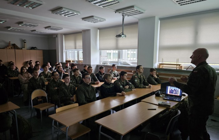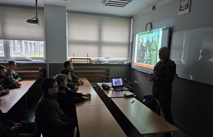 Motto wojsk obrony terytorialnej, stało się inspiracją dla zorganizowania 14.03.2025r. spotkania z przedstawicielem Wojsk Obrony Terytorialnej st.kpr. Januszem Szeją. Spotkanie dedykowane było uczniom klasy 5nGP oraz uczniom klas mundurowych. Tematyką poruszaną w trakcie spotkania były kwestie związane z rekrutacją do jednostek wojskowych oraz możliwości związane z taką koncepcją kariery zawodowej, a także roli jaką odgrywają Wojska Obrony Terytorialnej dla wsparcia poczucia bezpieczeństwa społeczności lokalnych.